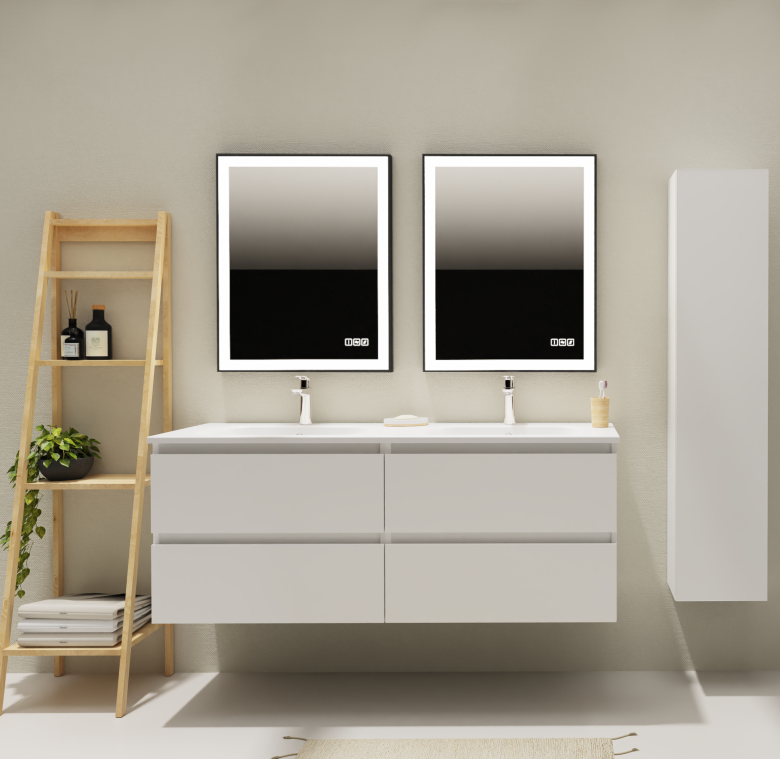 Une autre problématique repose sur l’installation. En effet, comme nous l’avons déjà évoqué, il est possible de vous équiper d’un meuble et même d’un ensemble de meuble de salle de bain double vasque reposant sur des pieds. Si vous optez pour cette solution, vous ne devrez pas percer de trous pour suspendre un tel mobilier. Et vous aurez le choix entre de multiples références disponibles sur notre boutique en ligne. Nous proposons notamment un meuble de salle de bain double vasque avec pieds, totalement blanc.